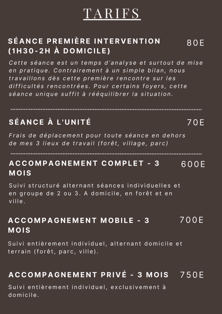 J’ai choisi de travailler à travers des accompagnements structurés, car d’après mon expérience, c’est la manière la plus efficace de proposer une éducation réellement complète et cohérente pour chaque chien.